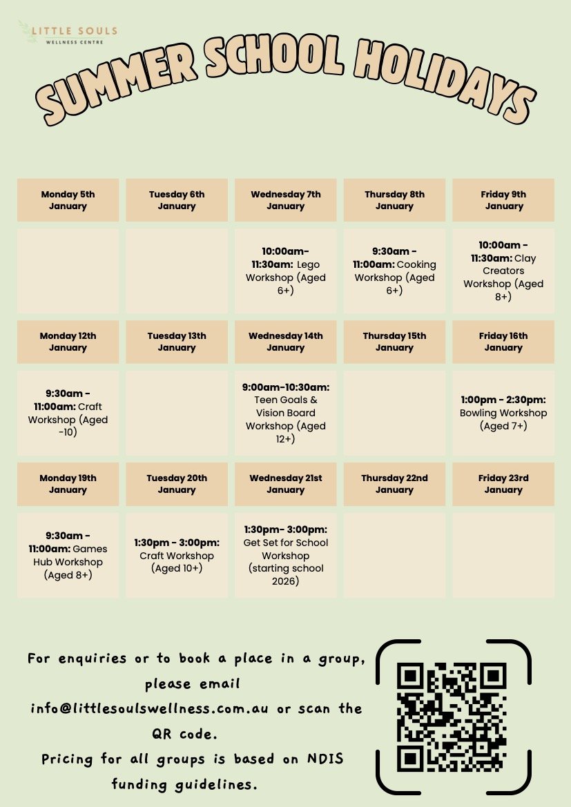 At Little Souls Wellness Centre, our multidisciplinary team facilitates multiple group programs for different age groups. We regularly update our programs and incorporate previous feedback to ensure our groups align with commonly shared goals and preferences.